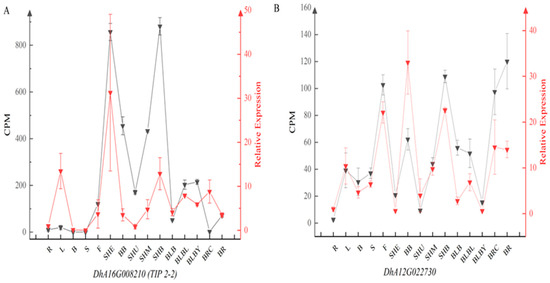 Relative expression of DhA16G008210 (TIP 2-2) (A) and DhA12G022730 (B) in D. brandisii. CPM: counts per million. The abbreviations on the X-axis represent different tissue types from the published D. brandisii transcriptome. R: root base, L: leaf, B: branch, S: culm, F: flower, SHE: sheath, BB: buds at the base of the culm, SHU/SHM/SHB: the upper, middle, and base of 50 cm tall shoots, BLB: bud primordium, BLBL: current-year bud, BLBY: annual bud, BRC: root primordium, BR: root tip.