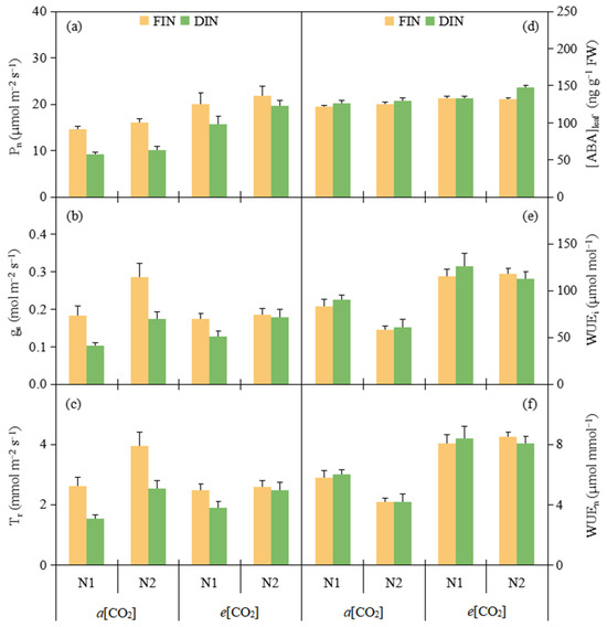 Leaf photosynthetic rate (Pn) (a), stomatal conductance (gs) (b), transpiration rate (Tr) (c), abscisic acid ([ABA]leaf) (d), intrinsic water use efficiency (WUEi) (e) and instantaneous water use efficiency (WUEn) (f) of tomato plants were affected by [CO2] concentration (a[CO2] and e[CO2]), N-fertigation regime (full irrigation during N-fertigation, FIN; deficit irrigation during N-fertigation, DIN) and N fertilizer level (N1 and N2). Error bars indicate standard error of the mean (n = 4). The results of ANOVA are shown in Table 1.