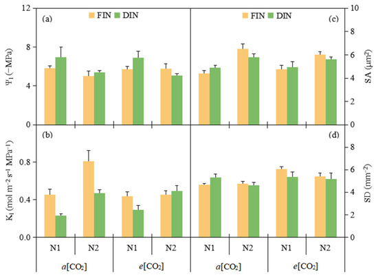 The Ψl under N2 (−5.31 MPa) was 16.25% higher than that under N1 (−6.34 MPa) (Figure 2a, Table 1). Kl under FIN and N2 (0.54 mol m−2 s−1 MPa−1 and 0.56 mol m−2 s−1 MPa−1) was 45.42% and 57.12% greater than that grown under DIN and N1 (0.37 mol m−2 s−1 MPa−1 and 0.35 mol m−2 s−1 MPa−1), respectively (Figure 2b, Table 1).