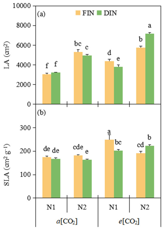 e[CO2] and N2 (5270.50 cm2 and 5793.88 cm2) tomato obviously enhanced 27.52% and 60.51% LA related to a[CO2] and N1 treatment (4133.06 cm2 and 3609.69 cm2), respectively (Figure 3a, Table 3). In comparison with a[CO2] (171.74 cm2 g−1), e[CO2] (216.75 cm2 g−1) improved 26.21% SLA across FN and N treatments (Figure 3b, Table 3).