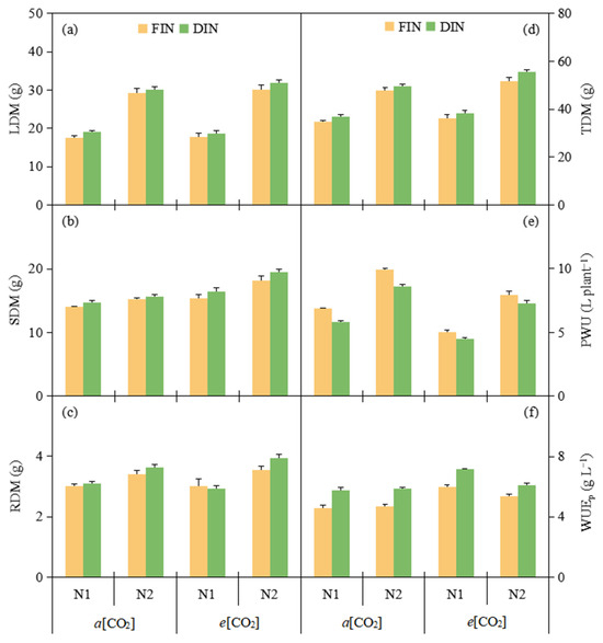 Results of three-way ANOVA for leaf area (LA), specific leaf area (SLA), leaf dry matter (LDM), stem dry matter (SDM), root dry matter (RDM), total dry matter (TDM), plant water use (PWU) and plant water use efficiency (WUEp) of tomato plants were affected by [CO2] concentration (a[CO2] and e[CO2]), N-fertigation regime (full irrigation during N-fertigation, FIN; deficit irrigation during N-fertigation, DIN) and N fertilizer level (N1 and N2). The detailed data are shown in Figure 3 and Figure 4.