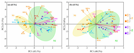 For a[CO2] (Figure 5a), N1 treatment mainly converged to the left part of the PCA plot in accordance with the vector direction of SD, Ψl, WUEi, WUEn, SRL and RTD. N2 treatment mainly converged to the right part of the PCA plot in accordance with the vector direction of leaf physiology and plant growth variables. Considering N-fertigation regime, the clustering of [N2, FIN] treatment mostly distributed in the upper right side, indicating greater plant dry matter parameters. Additionally, the clustering of [N2, DIN] treatment mostly distributed in the lower right side, indicating greater leaf gas exchange rates.