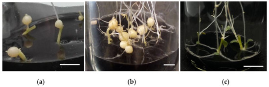 Potato Solanum tuberosum L. cv Alpha MTs development. (a) MTs development from stolon explants cultured in MR8-G6-2-iP medium after three weeks of incubation in darkness. The scale bar represents 1.0 cm. (b) Mature MTs development from stolon explants in MR8-G6-2-iP medium after two months of incubation in darkness. Scale bar represents 1.0 cm. (c) Stolon explants cultured in control conditions: MS medium, 1% sucrose, 3 g/L gelrite, 10 mg/L 2-iP, and 0.3% w/v activated charcoal in darkness. The scale bar represents 0.5 cm.