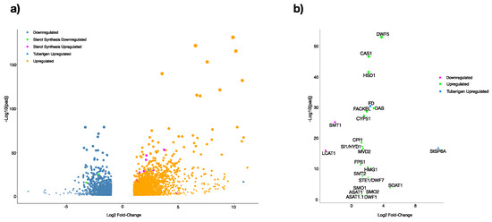 Volcano plot of differentially expressed genes (DEGs) in potato MTs induced in dark conditions. (a) DEG complete data set (>2-fold change and p < 0.05). (b) DEG of MVA-related and PS biosynthesis pathway genes.