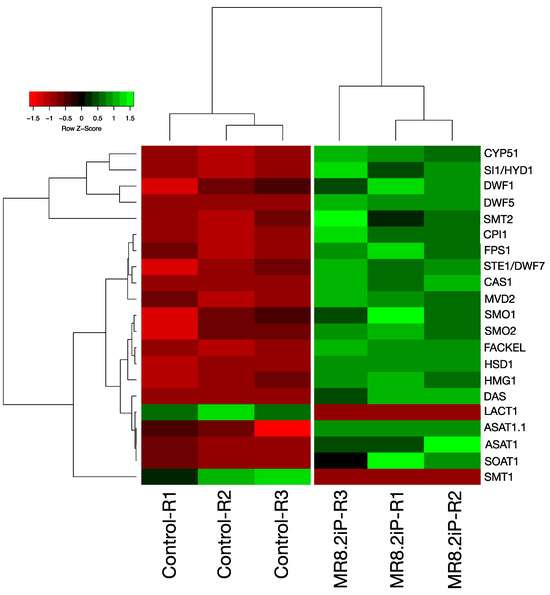To obtain an overview of the potato gene expression profile during the tuberization period, cDNA samples from tubers were subjected to RNAseq and transcriptomic analyses. Sequencing of cDNA libraries generated a total of 397,834,274 reads. Of these, 4756 transcript genes were significantly (>2-fold-change and p < 0.05) and differentially expressed. A total of 2896 transcript genes were up-regulated, and 1860 transcript genes were down-regulated (Figure 2a) [32]. It is remarkable that from the 4756 differentially expressed genes, 21 transcript genes (19 up-regulated and 2 down-regulated) correspond to MVA-related and PS biosynthesis pathway genes (Figure 2b). Moreover, we proceeded to compare the MVA-related and PS biosynthesis pathway gene expression levels between MTs induced in dark conditions and grown plants in control conditions from the normalized reads to TPM (transcripts per million). The hierarchical bi-clustering analysis was used to confirm the DEG analysis and to obtain a better perspective of the analyzed data (Figure 3).