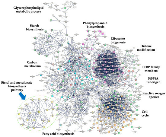To determine the interaction among the MVA-related and PS pathway gene products, a PPI network analysis was carried out with stringent parameters to ensure the robustness and confidence of the resulting protein interactions network. The confidence value was set at 0.800, which ensured a high degree of likelihood since, from the 19 DEGs of the MVA-related and PS biosynthesis genes, only 15 were kept in the resulting PPI network (Table 1). The modules of the PPI network found in this analysis are as follows: Ribosome biogenesis, cell cycle, carbon metabolism, starch biosynthesis, glycerophospholipid metabolic process, fatty acid metabolism, histone modification, reactive oxygen species (ROS), phenylpropanoid biosynthesis, PEBP family members, and PS and MVA biosynthesis pathways (Figure 4). Remarkably, the gene products of the MVA-related or PS biosynthesis pathway exhibited the highest degree of interaction, suggesting a tight regulation explicitly based on each biosynthetic pathway (Supplementary Data Table S1, Figure 5).