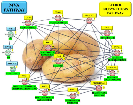 MVD2 executes the initial step in the production of isoprene-containing compounds, including PS and terpenoids. It is also a rate-limiting enzyme in the MVA pathway that synthesizes isopentenyl diphosphate (IPP) from mevalonate 5-diphosphate, which is the universal precursor of isoprenoids (IPP) [42,43]. In turn, FPS1 interacts with CAS1 (M1CST0_SOLTU, PGSC0003DMT400073861) (Figure 4), which carries out the conversion of 2,3-oxidosqualene to cycloartenol, leading this compound to the main PS synthesis (campesterol, sitosterol, and stigmasterol) in higher plants [44]. Furthermore, CAS1 is directly involved in the regulation of chlorophyll synthesis, cell division cycle regulation, cellular proliferation, and the regulation of cellular growth, development, and differentiation [16].