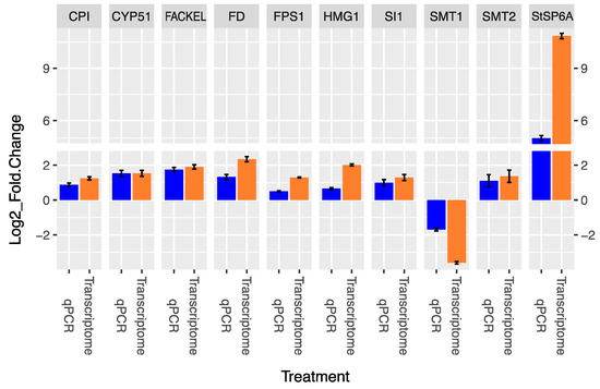 Finally, we selected the genes FSP1 and HMGR3 from the MVA-related pathway, CPI1, CYP51, FACKEL, SI1/HYD1, SMT1, and SMT2 from the PS biosynthesis pathway, and StSP6A and FD from the tuberigen regulatory pathway to determine whether the transcriptional behavior’s observed trend in the transcriptomic analysis is consistent with the expression levels assessed through quantitative PCR (qPCR) analysis. The qPCR analysis of the selected genes involved in the MVA-related PS biosynthesis and tuberigen regulation pathways showed an up-regulation trend, except for SMT1, which exhibited a down-regulation behavior, and altogether have been shown the same behavioral expression trend for both analytical approaches: transcriptomics and qPCR (Figure 6).