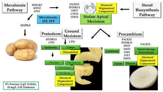 The MVA-related pathway is activated under darkness, providing MVA and IPP to balance the major plant PS (sitosterol, stigmasterol, and campesterol). PS biosynthetic gene modulations of FACKEL, SI1/HYD1, SMT1, CYP51, and SMO1 orchestrate and promote the establishment of the architecture of the apical meristem in the first developmental stages of tuber differentiation and in the vascular tissue’s development. SI1/HYDRA1 and CPI1 positively regulate the protoderm and the development, positively influencing the microtuberization enhancement process of potato.