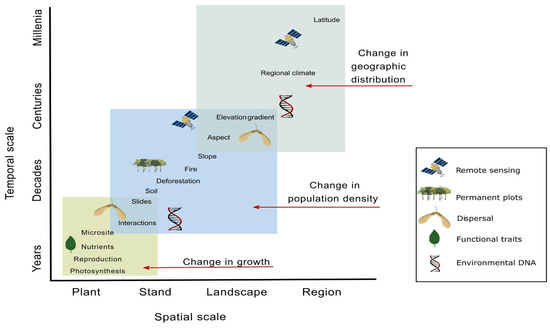 Conceptual diagram describing techniques for examining different questions across spatial and temporal scales in ecotones (modified from [10]).