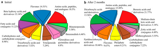 Top 10 categories of metabolites identified in litters of 4- and 8-year-old E. grandis at the initial decomposition stage (a) and two months after decomposition (b).