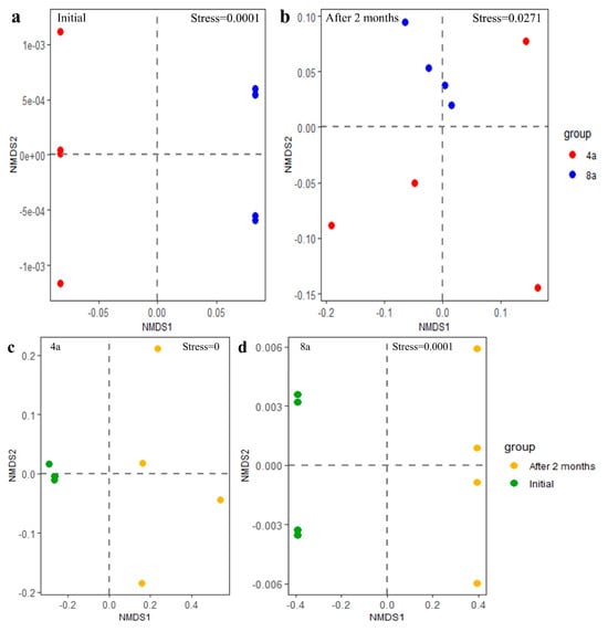 Non-metric multidimensional scale ordination for metabolites of 4- and 8-year-old E. grandis at the initial stage of leaf litter decomposition (a) and two months after decomposition (b); non-metric multidimensional scale ordination for metabolites at the initial stage of leaf litter decomposition and two months after decomposition at 4-year-old (c) and 8-year-old E. grandis (d).
