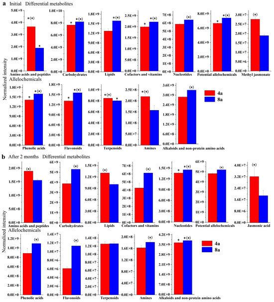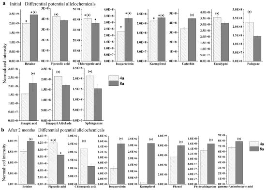 Normalization intensity of differential metabolites and potential allelochemicals in 4- and 8-year-old E. grandis at the initial stage of leaf litter decomposition (a) and two months after decomposition (b). * indicates significant differences between the two decomposition times; (*) indicates significant differences between the two aged E. grandis stands; p < 0.05. Error bars indicate the standard errors.