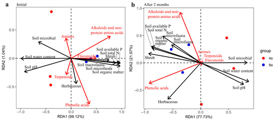 Redundancy analysis (RDA) diagram illustrating the relationship between soil physicochemical traits, soil biodiversity, and differential potential allelochemicals in 4- and 8-year-old E. grandis at the initial stage of leaf litter decomposition (a) and two months after decomposition (b).