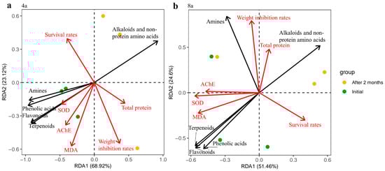 Redundancy analysis (RDA) diagram illustrating the relationship between differential potential allelochemicals and growth and physiological properties of E. fetida in the initial stage of leaf litter decomposition and two months after decomposition at 4-year-old (a) and 8-year-old E. grandis (b). The growth and physiological properties of E. fetida were standardized by Z-Score, in which the growth and physiological properties of E. fetida were 0 and 30 days of decomposition and 14 days of exposure to C4 concentration, respectively.