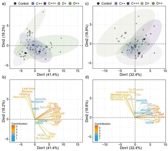 Principal component analysis (PCA) plots showing the ordination of the samples depending on the nature of amendment (C: compost; D: digestate) and rate (+; ++; +++) applied using the whole dataset for (a,b) St-Symphorien-sur-Saône and (c,d) Tavazzano soils. The ellipses represent a 95% confidence interval. Vectors are colored depending on their contribution to the overall distribution and indicate the direction and strength of each environmental variable.