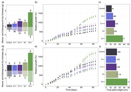 Impact of organic amendments on plant growth parameters (n = 10). (a,d) Aboveground and belowground dry biomass (g ± SE); (b,e) relative growth (% ± SE) of nettle plants during cultivation (days) and (c,f) final plant height (cm ± SE) of Urtica dioica after 83 days of cultivation depending on the nature of the amendment (C: compost; D: digestate) and the rate (+; ++; +++) applied to (a–c) St-Symphorien-sur-Saône and (d–f) Tavazzano soils. Different letters indicate significant differences between treatments and soils for each variable (Kruskal–Wallis, p < 0.05).