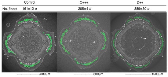 All amendments and doses applied to the St-Symphorien-sur-Saône soil significantly improved the stem diameter, and C+++ and D++ resulted in significantly more and longer internodes (Figure 3a). Concomitantly, the number of fibers increased significantly by 1.3 and 2.4 times under the C+++ and D++ treatments, respectively (Figure 4). Conversely, the fertilization did not significantly impact the fiber diameters, which ranged on average from 37 to 49 µm, or the wall thicknesses (Table S2). Among the plant parameters measured, plant height largely explained the aboveground biomass (F = 835.1; p < 0.001), followed by the leaf area (F = 26.7; p < 0.001), the number of leaves (F = 24.2; p < 0.001), and stem diameter (F = 9.6; p < 0.01).