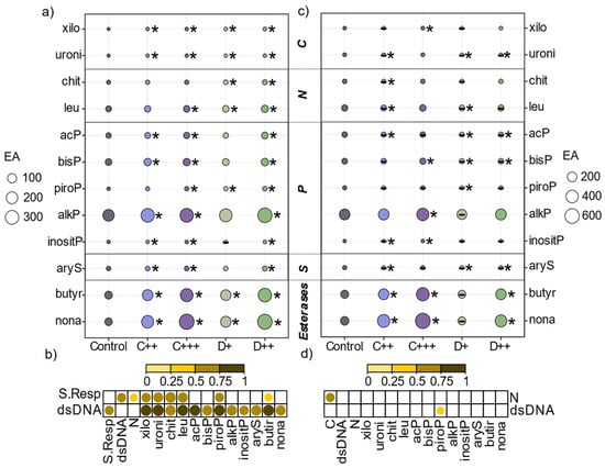 Impact of amendments on rhizospheric soil enzymatic activities. (a,c) Mean (n = 10) enzymatic activities (EA) expressed in nanomoles of 4-MUF·g−1 or AMC·g−1 soil per hour involved in carbon (C), nitrogen (N), phosphate (P), and sulfur (S) cycles and esterases depending on the nature of amendment (C: compost; D: Digestate) and rate (+; ++; +++) applied. * indicates a mean significantly different from that of the control treatment for each soil (Kruskal–Wallis or Tukey’s test, p < 0.05); - indicates a lower mean than that of the control. (b,d) Spearman’s correlation matrix between soil respiration (S.Resp), dsDNA, nitrogen (N) concentration, and enzymatic activities in (a,b) St-Symphorien-sur-Saône and (c,d) Tavazzano rhizospheric soils. Only the significant correlations are represented.