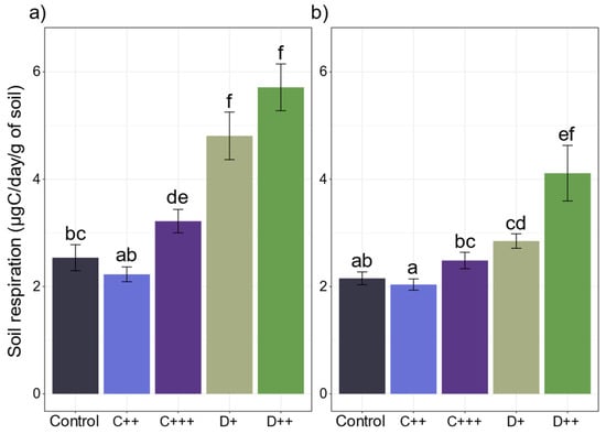 At the end of the cultivation period, all the amendments except C++ significantly improved the respiration of the St-Symphorien-sur-Saône soil, which doubled with digestate application (Figure 6a). Both amendments significantly increased dsDNA (Figure S1), which was correlated with soil respiration and enzymatic activities involved in C and N cycles (i.e., xilo, uroni, chit, and leu), alkP, and butyr activities (Figure 5b). In contrast, only the digestate application significantly impacted the respiration of the Tavazzano soil, with a two-fold increase with D++ treatment (Figure 6b). No correlation between soil respiration, dsDNA, and enzymatic activity was observed (Figure 5d).