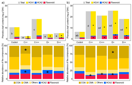 Impact of amendments on leaf phenolic compounds. Mean leaf total phenolic, hydroxycinnamic acid 1 (HCA1), hydroxycinnamic acid 2 (HCA2), and flavonoid concentrations (n = 5, mg·g−1DW ± SE) depending on the nature of amendment (C: compost; D: digestate) and rate (+; ++; +++) applied in (a) St-Symphorien-sur-Saône and (b) Tavazzano soils and their relative quantitative abundances in percentage (chlorogenic acid (CGA), caffeoylmalic acid (CMA) and others are related to HCA1). Different letters indicate significant differences between treatments and soils for total phenolic compounds (Kruskal–Wallis test, p < 0.05). * indicates significant differences from the control for each considered compound and for each soil (Tukey’s test, p < 0.05).