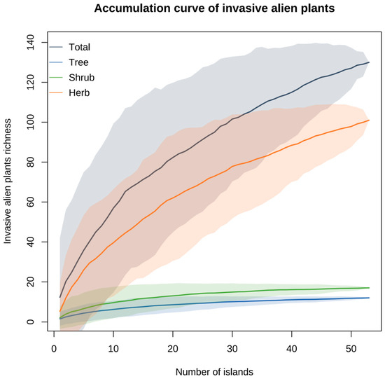 - Xie, Y.; Xie, X.; Weng, F.; Nong, L.; Lin, M.; Ou, J.; Wang, Y.; Mao, Y.; Chen, Y.; Qian, Z.; et al. Distribution Patterns and Environmental Determinants of Invasive Alien Plants on Subtropical Islands (Fujian, China). Forests 2024, 15, 1273. [Google Scholar] [CrossRef]