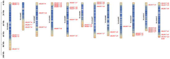 Chromosome localization of SlGH17 genes. Note: SlA6 is SlGH17-43. Note: Blue-white-red represents an increasing density of genes. Red represents gene names and black represents chromosome names.