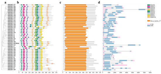 The gene structure, protein motif, and conserved protein domains of SlGH17s based on their evolutionary relationship. Note: (a) Evolutionary analysis of SlGH17s; (b) conserved motif visualization of SlGH17s; (c) conserved domain visualization; (d) gene structure visualization. CDS: coding sequences; UTR: untranslated regions.