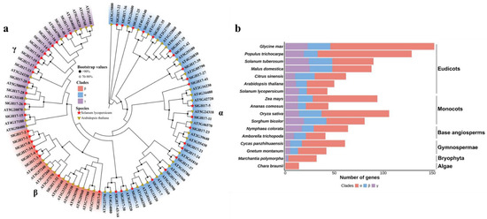 Phylogenetic and family numbers analysis of GH17 genes in different plant species. Note: (a) ML phylogenetic evolutionary trees of SlGH17s and AtGH17s, generated by using IQ-tree software (version: 2.3.6). All GH17 family genes were grouped into three subfamilies, named α, β, and γ. The α subfamilies are colorized by the blue zone; β subfamilies are colorized by the red zone. The purple zone is the γ subfamilies. The red five-pointed star represents tomato GH17s, and the yellow five-pointed star represents Arabidopsis GH17s. (b) Analysis of the GH17 family members in different plant species.