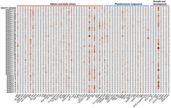 Cis-acting elements Analysis of the promoter region of SlGH17s. Note: The value in the circle represents the number of the cis-acting elements. The redder the color, the more cis-acting elements it contains.