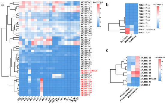 Expression analyses of SlGH17s in various tomato tissues. Note: (a) Expression analysis of SlGH17s in various Micro-Tom tomato tissues, 10 genes (in red color) showed the specifically highest expression in the flower bud at stage F30 and flower at stage F45, (b) expression analysis of 10 specifically expressed genes in anthers at different development stages of Micro-Tom tomato, (c) expression analysis of 10 specifically expressed genes in pollen at different development stages of Ailsa Craig tomato; samples F30, L30, R30, and S30 are flowers, leaves, roots, and stems collected 30 days after germination; samples F45, L45, R45, and S45 are flowers, leaves, roots, and stems collected 45 days after germination; samples L85, F85, and S85 are leaves, roots, and stems collected 85 days after germination; and samples 10DPA, 20DPA, IMG, MG, Br, Br3, Br7, Br10, and Br15 samples are fruit samples collected at 55, 65, 75, 80, 85, 92, 95, and 100 days after germination, respectively. The bud-2mm, bud-4mm, and bud-8mm samples are the tomato anthers collected when the length of the bud was 2 mm (microspore mother cell stage), 4 mm (tetrad stage), and 8 mm (mature pollen stage). Pollen-tetrad, pollen-meiotic, and pollen-mature are the pollen samples at different periods of pollen development.