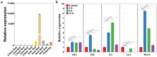 Expression pattern analyses of SlA6 during tomato flower development and in response to phytohormones. Note: (a) Analysis of the expression pattern of SlA6 in tomato bud. (b) Analysis of the expression patterns of SlA6 in response to plant hormones in tomato seedlings. Sample names 0.5 mm, 1 mm, 1.5 mm, 2 mm, 2.5 mm, 3 mm, 4 mm, 6 mm, 8 mm, and on the day of flowering, are samples of the corresponding lengths of flower buds. ABA is abscisic acid, Eth is ethylene, GA is gibberellin, IAA stands for auxin, and MeJA is Methyl jasmonate. “***”, p < 0.001.