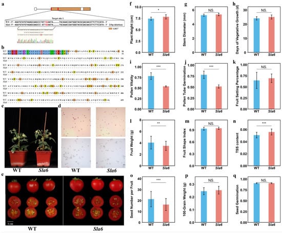 Fruits of the wild-type and Sla6 mutant at the Br+7 stage were collected for the fruit quality examination. The results revealed that the Sla6 fruits had a significantly lower weight compared to the wild-type (WT) (Figure 7c,l). The fruit shape index of Sla6 was not significantly different from the WT (Figure 7m). However, the total soluble solids (TSSs) content in Sla6 was significantly higher than in the WT (Figure 7n). Additionally, the number of seeds per Sla6 fruit was significantly reduced compared to the WT (Figure 7o). The 100-seed weight of Sla6 seeds showed no significant difference from the WT (Figure 7p), and there was no difference in seed germination or the germination index between Sla6 and the WT (Figure 7q).
