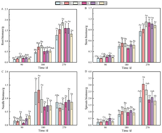 Changes in biomass accumulation of roots (A), stems (B), needles (C), sprouts (D), aboveground parts (E), and individuals (F) of P. yunnanensis with fertilization time. (Note: different uppercase letters indicate significant differences between times within the same treatment (p < 0.05). Different lowercase letters indicate significant differences between treatments at the same time (p < 0.05); the same as below).