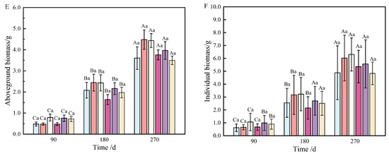 As shown in Figure 1F, individual plant biomass accumulation was more pronounced under T2, T3, and T5 fertilization. Generally, except for T5 and T6, there was no significant growth between 180 and 270 days; however, biomass under other treatments increased significantly over time.