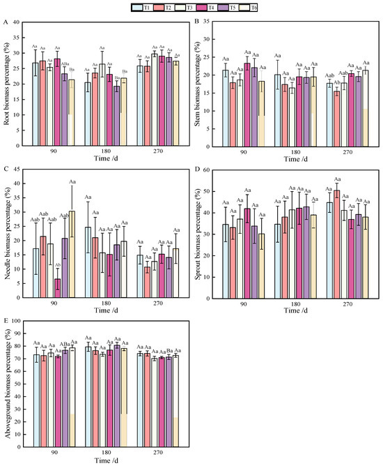 Aboveground biomass, composed of stem, needle, and sprout biomass, showed significant differences under the combined nitrogen–phosphorus treatment at 90 days when compared with other treatments (Table 2). As fertilization time increased, T2, T3, and T5 exhibited a strong promoting effect on the growth of aboveground components (Figure 1E). From 90 to 270 days, biomass allocation showed an initial increase followed by a decrease. Notably, T5 fertilization significantly reduced aboveground biomass from 180 to 270 days (Figure 2E).