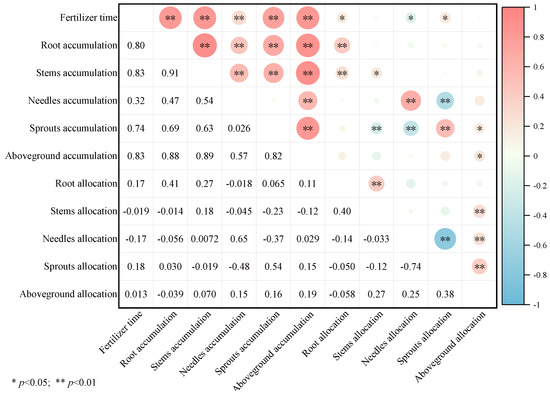 The correlation between biomass accumulation and distribution of each component of P. yunnanensis with time under different fertilization treatments. (Note: * p < 0.05; ** p < 0.01).