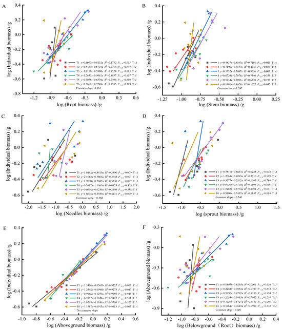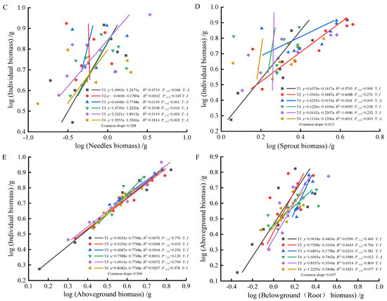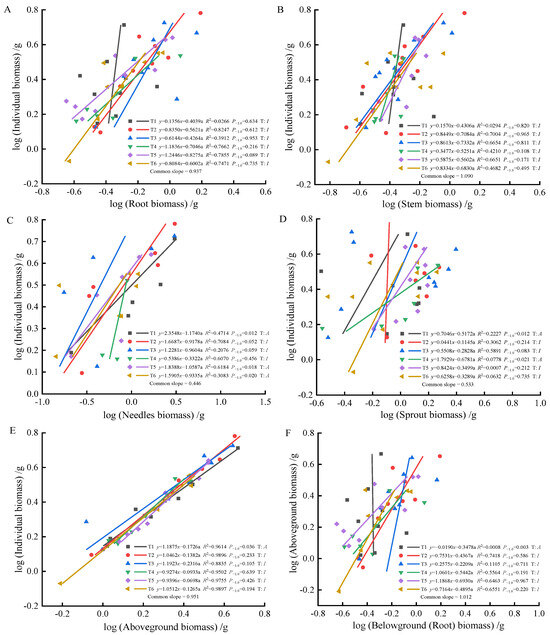 At 90 days, the biomass of individual plant and root (A), stem (B), needle (C), sprout (D), aboveground biomass (E); the allometric relationship between aboveground and belowground biomass (F). (Note: P−1.0 indicates the significance of the difference between the slope and the theoretical value of 1.0. ‘T’ indicates the type, ‘A’ indicates allometric relationships, ‘I’ indicates isometric relationships).