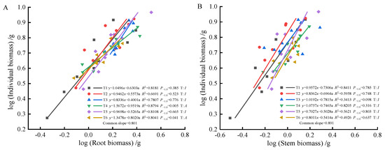 As fertilization time progressed from 90 to 270 days, root-individual biomass (Figure 4A, Figure 5A and Figure 6A) showed faster growth in T1 during the early stages, with isometric growth relationships observed in the middle and later stages. In contrast, T6 exhibited faster growth in the later stages, displaying an allometric growth relationship. For stem-individual biomass (Figure 4B, Figure 5B and Figure 6B), T1 and T3 showed isometric growth as fertilization time increased in the later stages. Regarding leaf-individual biomass (Figure 4C, Figure 5C and Figure 6C), T4 effectively promoted needle growth at 270 days, while T2 had no noticeable effect, indicating isokinetic growth. In terms of sprout-individual biomass (Figure 4D, Figure 5D and Figure 6D), T3 had a higher growth rate, while T1 exhibited slower growth during the early and middle stages as seedlings matured. For aboveground-individual biomass (Figure 4E, Figure 5E and Figure 6E), T1 and T2 showed allometric growth in the early and middle stages, transitioning to isokinetic growth in the later stages as fertilization time extended. Lastly, for aboveground and underground biomass (Figure 4F, Figure 5F and Figure 6F), the growth rate of T4 seedlings was higher in the later stages compared to the early and middle stages, showing an allometric growth pattern.
