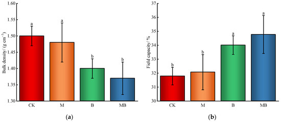 Soil physical properties. Bulk density (a). Field capacity (b). CK denotes untreated irrigation, M denotes magnetized ionized water irrigation, B denotes untreated water irrigation with 45 kg ha−1 B. subtilis, and MB denotes magnetized water irrigation with 45 kg ha−1 B. subtilis. The data represent the average of the three replicates. Different letters above the bars indicate significant differences among treatments at p < 0.05.