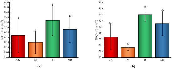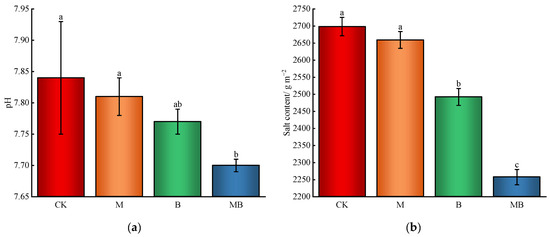 Soil salinity and alkalinity. Soil pH (a). Salt content (b). CK denotes untreated irrigation, M denotes magnetized ionized water irrigation, B denotes untreated water irrigation with 45 kg ha−1 B. subtilis, and MB denotes magnetized water irrigation with 45 kg ha−1 B. subtilis. The data represent the average of the three replicates. Different letters above the bars indicate significant differences among treatments at p < 0.05.