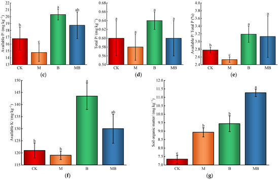 Soil nutrient content. content (a). content (b). Available P content (c). Total P content (d). Available P content/Total P content (e). Available K content (f). Soil organic matter content (g). CK denotes untreated irrigation, M denotes magnetized ionized water irrigation, B denotes untreated water irrigation with 45 kg ha−1 B. subtilis, and MB denotes magnetized water irrigation with 45 kg ha−1 B. subtilis. The data represent the average of the three replicates. Different letters above the bars indicate significant differences among treatments at p < 0.05.