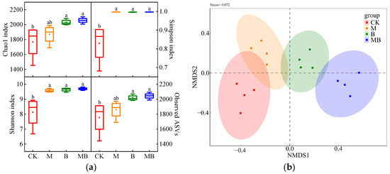 Soil bacterial communities’ α diversity (a) and NMDS analysis (b) under different regulatory measures. CK denotes untreated irrigation, M denotes magnetized ionized water irrigation, B denotes untreated water irrigation with 45 kg ha−1 B. subtilis, and MB denotes magnetized water irrigation with 45 kg ha−1 B. subtilis. The data represent the average of the four replicates. Errors bars indicate standard errors. Different letters above the bars indicate significant differences among treatments at p < 0.05.