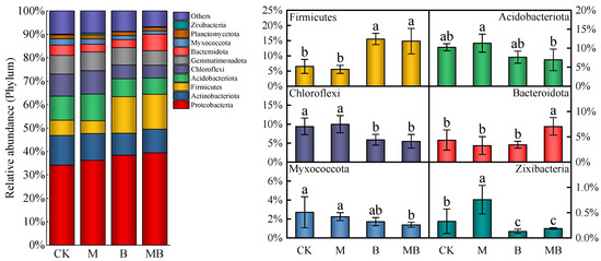 Relative abundance of bacterial community composition at the top 10 phylum levels under different regulatory measures. CK denotes untreated irrigation, M denotes magnetized ionized water irrigation, B denotes untreated water irrigation with 45 kg ha−1 B. subtilis, and MB denotes magnetized water irrigation with 45 kg ha−1 B. subtilis. The data represent the average of the four replicates. Errors bars mean standard errors. Different letters above the bars indicate significant differences among treatments at p < 0.05.
