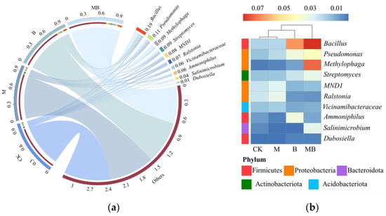 The taxonomic analysis results showed that 11,972 ASVs were obtained from 16 samples selected from the four regulatory measures. These ASVs were divided into 48 phyla, where the main bacterial communities in the soil under different regulatory measures were similar, yet significant differences in relative abundance were observed. Figure 5 illustrates the composition of the top 10 bacterial phyla with relative abundance in the soil under different regulatory measures. The dominant phyla identified were Proteobacteria (34.1–39.4%), Actinobacteriota (9.4–12.7%), Firmicutes (5.5–15.5%), and Acidobacteriota (6.9–11.3%). The impact of various regulatory measures on the relative abundance of Proteobacteria and Actinobacteriota was insignificant. However, the introduction of B. subtilis not only increased the relative abundance of Firmicutes, to which B. subtilis belongs, but also potentially influenced the microbial community structure. Specifically, B and MB treatments increased the relative abundance of Firmicutes by 139.4% and 128.3%, respectively, compared to CK. This suggests that the introduction of B. subtilis may have cascading effects on the overall microbial composition. The soil bacterial community was further categorized into 822 genera. Figure 6 displays the relative abundance composition of the top 10 soil bacterial genera under different regulatory measures. The dominant genera identified were Bacillus (2.0–8.1%), Pseudomonas (1.6–4.1%), Methylophaga (0.3–7.2%), and Streptomyces (1.6–3.2%). The B treatment significantly impacted (p < 0.05) the relative abundance of Bacillus compared to CK, increasing it by 235.7%, while the M treatment did not. Additionally, the MB treatment significantly affected (p < 0.05) the relative abundance of Bacillus compared to B, increasing it by 21.9%. These observations indicated that the applied B. subtilis successfully colonized the soil, and magnetized ionized water significantly promoted the relative abundance of Bacillus.