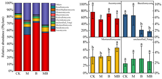 Relative abundance of fungal community composition at the top 10 phylum level under different regulatory measures. CK denotes untreated irrigation, M denotes magnetized ionized water irrigation, B denotes untreated water irrigation with 45 kg ha−1 B. subtilis, and MB denotes magnetized water irrigation with 45 kg ha−1 B. subtilis. The data represent the average of the four replicates. Errors bars indicate standard errors. Different letters above the bars indicate significant differences among treatments at p < 0.05. “Others” refers to fungal species that have been classified but do not belong to the main groups of interest in our study. “Unclassified fungi” includes fungal sequences that could not be accurately classified at a finer taxonomic level due to limitations in the available database or sequence similarity. These fungi could not be assigned to a specific taxonomic group beyond a broad level.