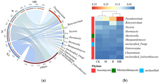 Relationships between dominant fungal genus and regulatory measures (a) and heat map of dominant genus of fungal communities under different regulatory measures (b). CK denotes untreated irrigation, M denotes magnetized ionized water irrigation, B denotes untreated water irrigation with 45 kg ha−1 B. subtilis, and MB denotes magnetized water irrigation with 45 kg ha−1 B. subtilis.