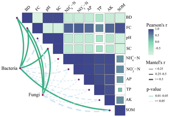 The examination shows intricate connections between soil properties and the composition of microbial communities (Figure 10). Soil bulk density (BD) and field capacity (FC) are negatively correlated. Specifically, soil pH and salt content (SC) have an inverse effect on the nutrient levels in the soil, including , , available P (AP), total P (TP), available K (AK), and soil organic matter (SOM). The top four bacterial genera in relative abundance (Bacillus, Pseudomonas, Methylphaga, and Streptomyces) and the top four fungal genera (Pseudeurotium, Botryotrichum, Nectria, and Hormiactis) were selected for the bacterial and fungal matrices in the Mantel test. The test results demonstrate strong correlations (r > 0.5) between dominant bacterial and fungal genera and soil BD, FC, pH, SC, and SOM. Notably, significant correlations (p < 0.05) were observed between BD, FC, SC, and SOM with dominant bacterial genera, as well as between BD, FC, and SC and dominant fungal genera (p < 0.05). These findings suggest a broader ecological phenomenon where soil structure, salinity and alkalinity, and organic matter influence microbial abundance. The results thus imply potential strategies for enhancing microbial activity, such as managing soil structure and salinity and alkalinity and enriching organic matter.