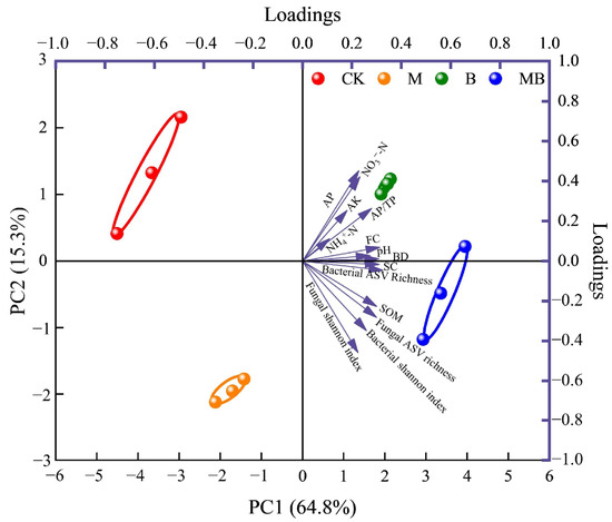 Principal component analysis of soil properties. CK denotes untreated irrigation, M denotes magnetized ionized water irrigation, B denotes untreated water irrigation with 45 kg ha−1 B. subtilis, and MB denotes magnetized water irrigation with 45 kg ha−1 B. subtilis.