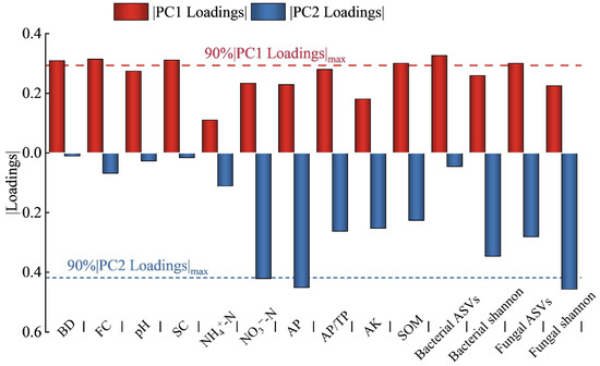 The dimensionless values of soil indicators, standardized from their determined values, underwent PCA analysis, yielding two principal components with eigenvalues exceeding 1, and accounting for a cumulative variance contribution rate of 78.9%. The distinct distribution of four regulation measures across different quadrants suggested significant individual effects on soil quality (Figure 11). Principal component 1 (PC1), with a variance contribution rate of 64.8%, showed higher loadings for BD, FC, SC, AP/TP, SOM, and bacterial and fungal ASVs. Principal component 2 (PC2), contributing 15.3% variance, revealed higher loadings for pH, , , AP, AK, and bacterial and fungal Shannon index. Selecting soil indicators with high loadings in both components (absolute values exceeding 90% of the highest factor loading) led to a minimal dataset (MDS) of key soil quality indicators (Figure 12). These key indicators (BD, FC, SC, SOM, , AP, bacterial ASVs, and fungal ASVs and Shannon index) formed the basis for calculating the SQI (Figure 13). All regulation measures significantly impacted (p < 0.01) the SQI compared to CK, with the M, B, and MB treatments increasing it by 0.21, 0.52, and 0.69 units, respectively.
